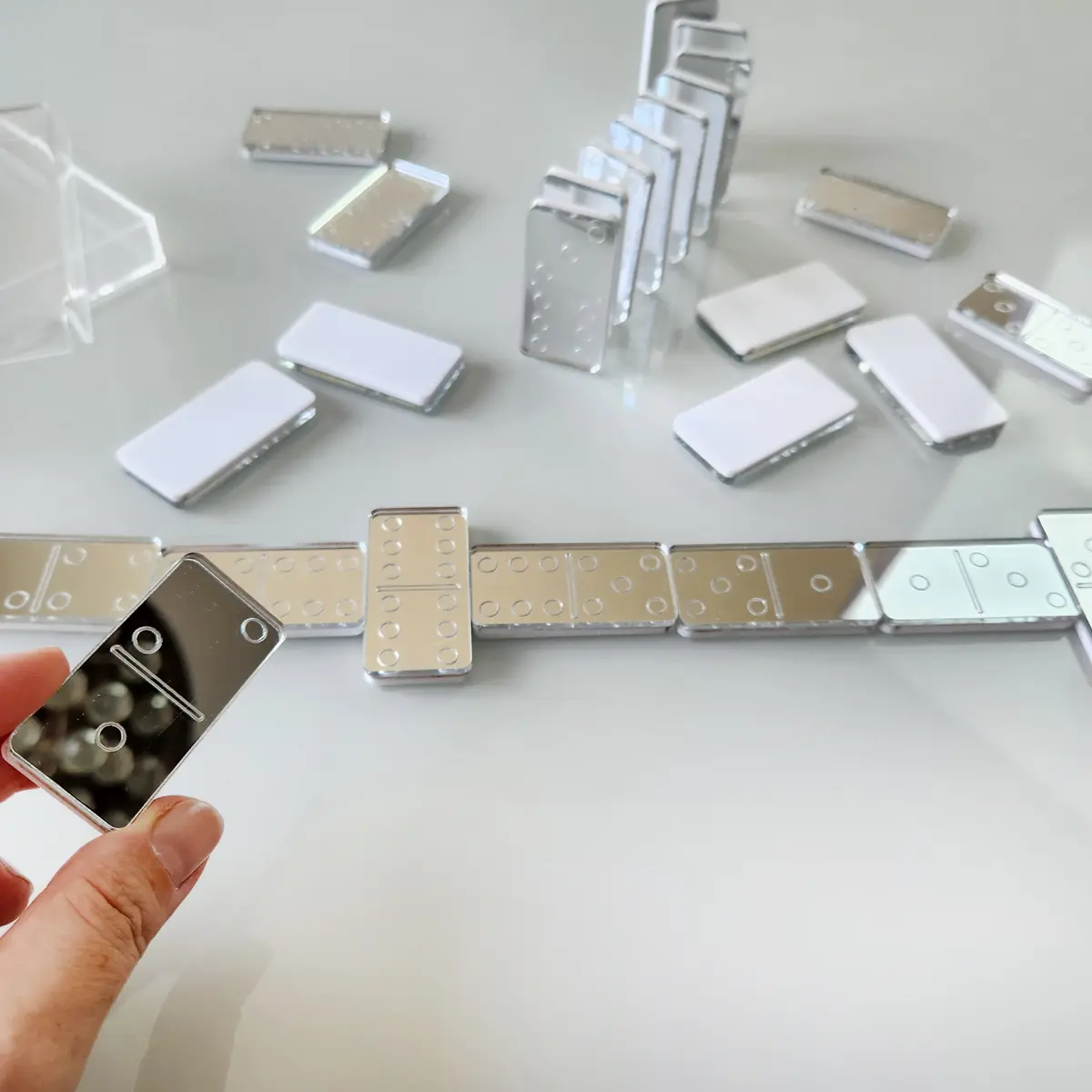 O Jogo de Dominó em Acrílico Prateado Personalizado da LevCut Decor é a escolha perfeita para quem busca um presente elegante, moderno e atemporal. Produzido em acrílico prateado de alto brilho, ele combina design contemporâneo com personalização exclusiva, tornando-se um item funcional e decorativo ao mesmo tempo.